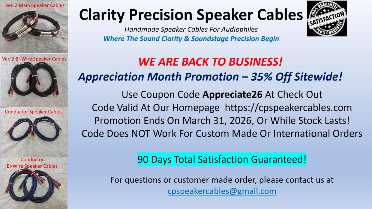 "Clarity Precision Ver. 2 Bi-Wire Speaker Cables out-perform my Audioquest bi-wire speaker cables which I paid 3X the money. Superior sound clarity, sound stage precision and liveness even my wife, not an audiophile, can tell the differences. Too bad, I won't be able to return the AudioQuest cables."